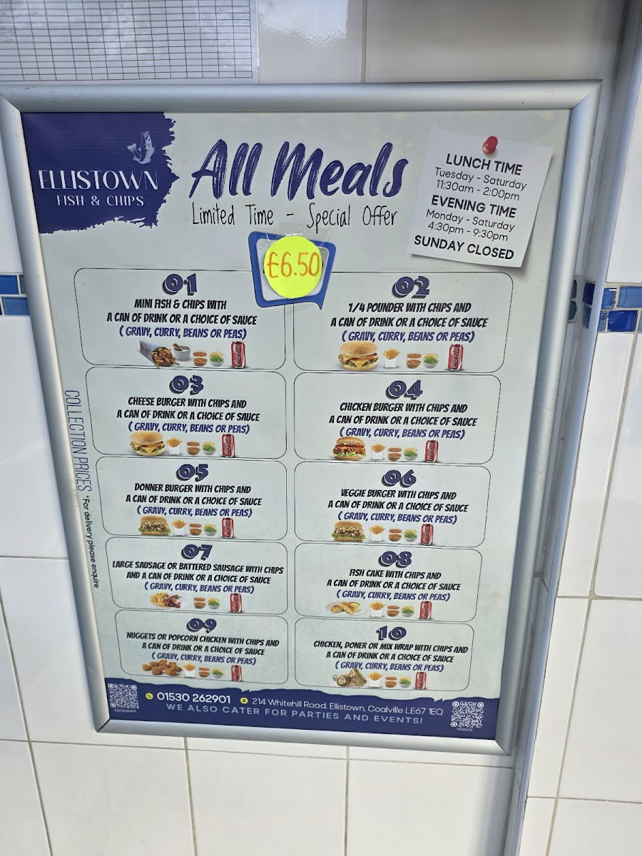 From a reviewer’s perspective, the menu at Ellistown Fish & Chips offers a wide and satisfying selection that covers classic takeaway favourites and hearty meal deals. Highlights include the Southern Fried Wings options such as 4pcs Southern Fried Wings and 8pcs Southern Fried Wings & Chips, alongside a solid burger range featuring the Beef Burger, Cheese Burger, Double Cheese Burger, Chicken Fillet Burger, and Veggie Burger. The kebab section is particularly varied, with choices like Regular Lamb Donner Kebab In Pitta, Regular Chicken Kebab In Pitta, Regular Mixed Kebab In Pitta, and larger options such as Large Donner Meat & Chips and Large Chicken Meat & Chips, plus newer items like Small Lamb Seekh Kebab In Pitta and Special Donner Tray. Traditional chip shop staples are well represented with fish items such as Regular Haddock, Fish Cake, Cod Roe, 10pcs Scampi, and 6pcs Fish Bites, as well as pies like Chicken & Mushroom Pukka Pie, Steak & Kidney Pukka Pie, and Beef & Onion Pukka Pie. There are also plenty of sides including 6pcs Mozzarella Sticks, Jumbo Spring Roll, and chip combinations like Regular Chips & Curry and Large Cheesy Chips. For something different, the Chicken Meat & Rice healthy option is a nice addition. To finish, dessert and drinks options such as 465ml Ben & Jerry's Half Baked Ice Cream, 460ml Hagen-Dazs Belgian Chocolate Ice Cream, Kinder Bueno Milkshake, and 330ml Coke Can round out a menu that is diverse, filling, and well suited to a classic British takeaway experience.